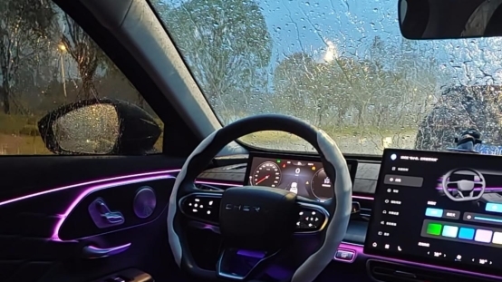 抵达徐闻港时,等待过海的车辆已经排起了三公里的长龙。天空突然乌云密布,倾盆大雨说来就来。看着窗外冒雨跑向洗手间的游客,我们果断决定开启”车内度假模式”。媳妇熟练地打开24.6吋悬浮式双联屏,继续追她的《大如传》。高通骁龙8155芯片让车机流畅得不像话,切换应用毫无卡顿。等待的过程中,我们看着其他车主在雨中狼狈奔跑,媳妇感慨:”感觉我们像是在看一场真人秀。”