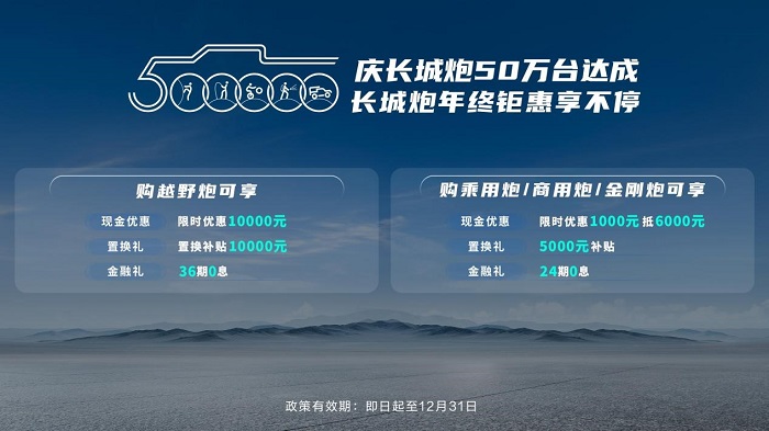 长城炮品牌四周年,成为首个突破50万台的中国高端皮卡品牌,创造了新的“长城炮速度”。感恩回馈用户支持与厚爱,长城炮年终钜惠重磅来袭:即日起至12月31日,购买越野炮,尊享限时优惠10000元、置换补贴10000元、金融贴息36期0息等超值优惠;购买乘用炮、商用炮、金刚炮,尊享限时优惠1000元抵6000元、置换补贴5000元、金融贴息24期0息等钜惠福利。